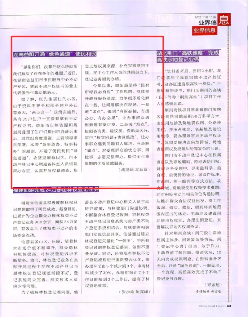 《中国不动产》:湖南益阳开通“绿色通道”便民利民