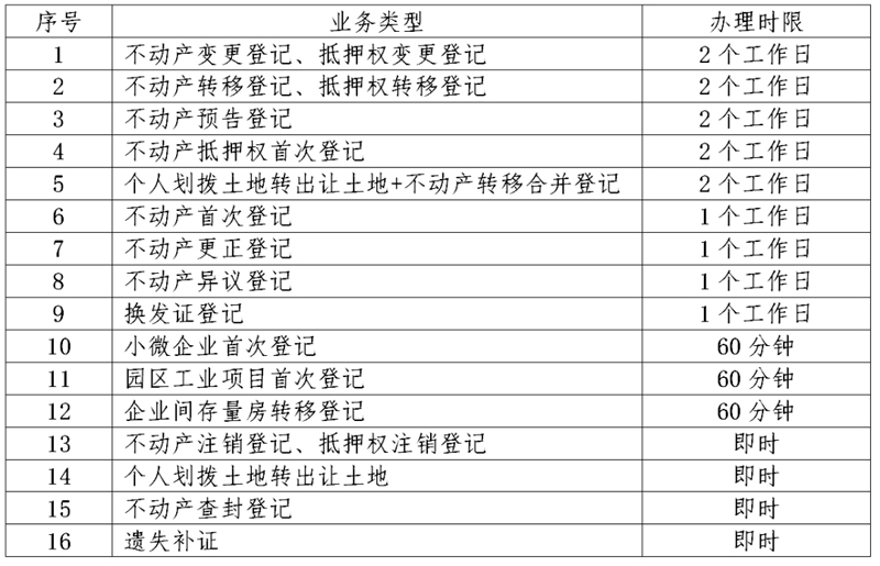 为进一步优化营商环境,推动不动产登记高质量发展,经研究,市不动产登记中心进行第八次业务办理提速,所有不动产登记业务办结时限压缩在2个工作日内办结,努力构建便捷高效、便民利民的不动产登记工作机制。自2023年3月1日起,各类不动产登记业务办结时限调整如下: