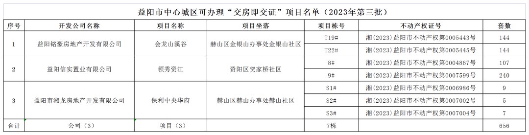 现将益阳市中心城区2023年第三批实施新建商品房“交房即交证”的项目予以公布,共3个公司,3个项目,7栋房屋,656套。项目开发企业和购房者可共同申请转移(分户)登记,我中心将根据购房者实际需要,为购房者提供不动产权证书免费邮政 EMS 邮寄服务。