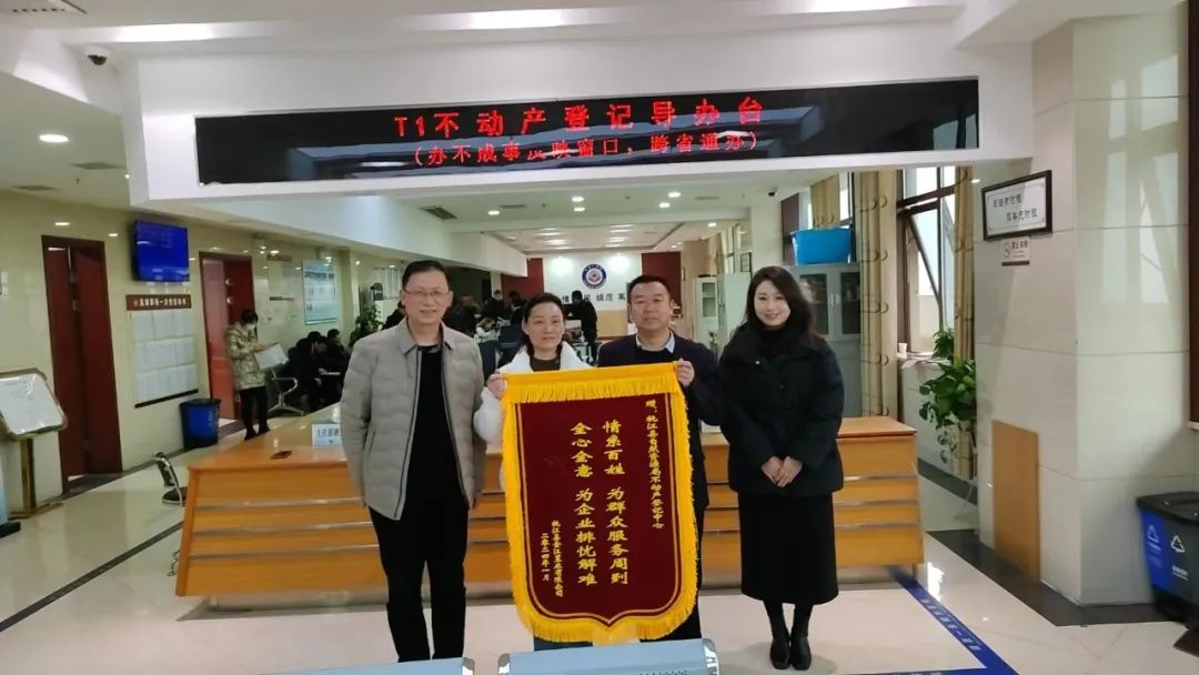 上班伊始,桃江县金江置业有限公司负责人就向桃江县不动产登记中心送来了写有"情系百姓,为群众服务周到;全心全意,为企业排忧解难"的锦旗,点赞"交房即交证"这一便民惠企之举,表达对该中心优质高效、服务周到的感谢。